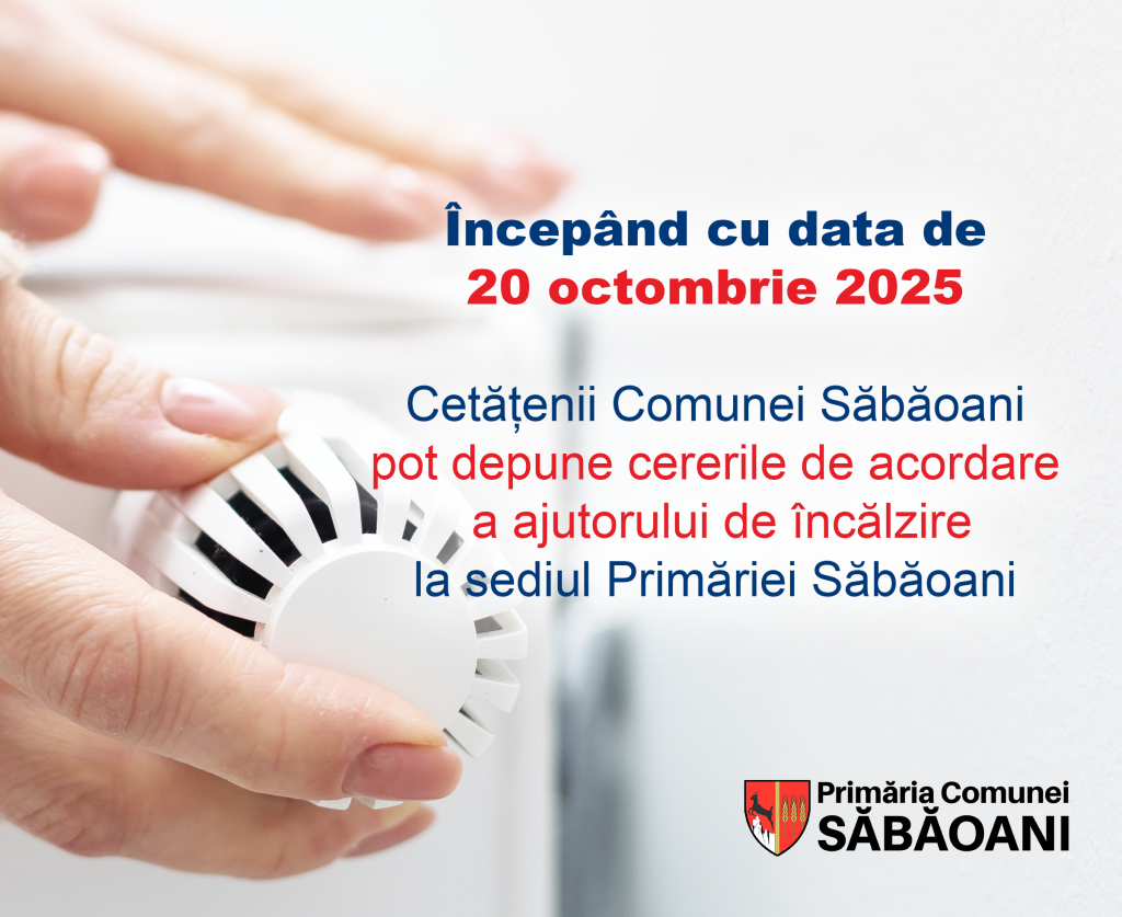 ÎNCEPÂND CU DATA DE 20 OCTOMBRIE 2025 SE VOR DISTRIBUI CERERILE PENTRU OBȚINEREA AJUTORULUI DE ÎNCĂLZIRE ȘI A SUPLIMENTULUI PENTRU ENERGIE ( FORMULARELE SE GĂSESC LA SEDIUL PRIMĂRIEI).